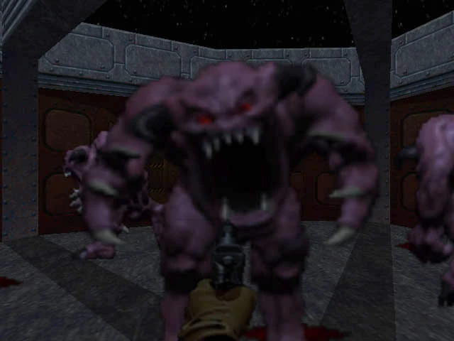 Doom 64 includes the demon, occasionally called a "bull demon". It first appears in MAP01: Staging Area. It underwent a new design, giving it a bulkier and more menacing appearance, with black horns, smaller red eyes, and accentuated teeth and claws.