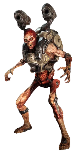 Revenants are UAC Military operatives that have been methodically transformed into demonic combatants through cybernetic augmentation and repeated Lazarus Wave exposure. The transformation begins by attaching a Multiple Launch Rocket Battery (MLRB) onto each shoulder of the patient, coupled to an Argent-charged neural biochip implanted at the base of the cerebral cortex. The MLRB allows the Revenant to both attack its target with multiple conventional rockets, and also to fire mobility boosters located under each MLRB.